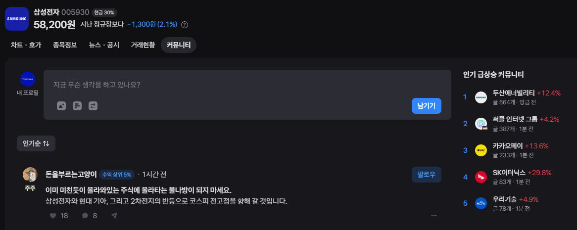 마지막으로 '커뮤니티' 탭에서는 다른 투자자들의 실시간 반응과 의견을 볼 수 있습니다. 이곳에서는 주가 변동에 대한 다양한 의견이 오가기 때문에, 시장의 분위기를 파악하는 참고 자료로 활용할 수 있습니다. 이처럼 토스증권은 삼성전자 주가 정보뿐만 아니라, 투자를 위해 필요한 거의 모든 정보를 쉽고 체계적으로 제공하고 있습니다. 이러한 데이터들을 적극적으로 활용하여 자신만의 투자 원칙을 세우고 성공적인 투자를 이어가시길 바랍니다.