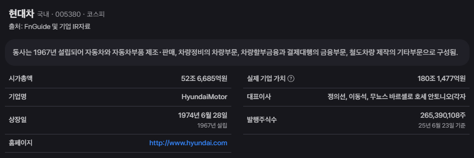 현대차는 1967년에 설립되어 오랜 역사를 자랑하는 대한민국 대표 자동차 제조 기업입니다. 주요 사업 부문은 자동차 및 부품 제조·판매, 차량 정비 서비스를 제공하는 차량 부문과 할부 금융, 결제 대행 등 금융 부문, 그리고 철도 차량 제작을 포함하는 기타 부문으로 나뉩니다. 정의선, 이동석, 호세 안토니오 무뇨스 바르셀로가 각자 대표이사를 맡고 있으며, 발행된 주식 수는 총 265,390,108주에 달합니다.