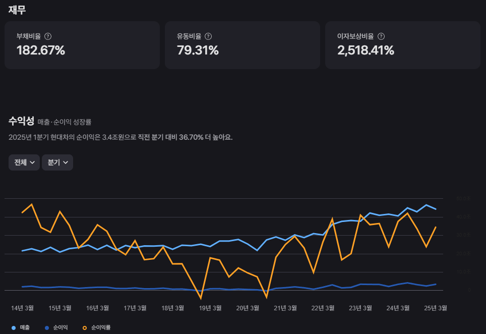 부채비율은 다소 높은 편이지만, 이는 자동차 산업의 특성상 금융 부문의 부채가 포함되어 있기 때문입니다. 2024년 1분기 기준 부채비율은 182.09%로, 동종 업계 중앙값인 126.79%와 비교하면 다소 높지만, 꾸준한 매출과 이익 성장을 통해 안정적으로 관리되고 있습니다. 매출액 역시 지속적인 성장세를 보이며, 이는 현대차가 글로벌 시장에서 경쟁력을 유지하고 있음을 증명합니다.