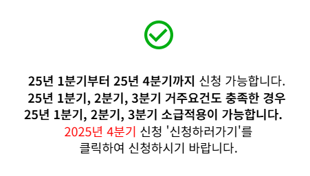 - 이전 분기 미신청자: 이번 4분기 신청 시, 지나간 1~3분기 분에 대한 소급 신청이 가능합니다. 자격이 된다면 최대 100만 원까지 한 번에 받을 수 있으니 놓치지 마세요.
