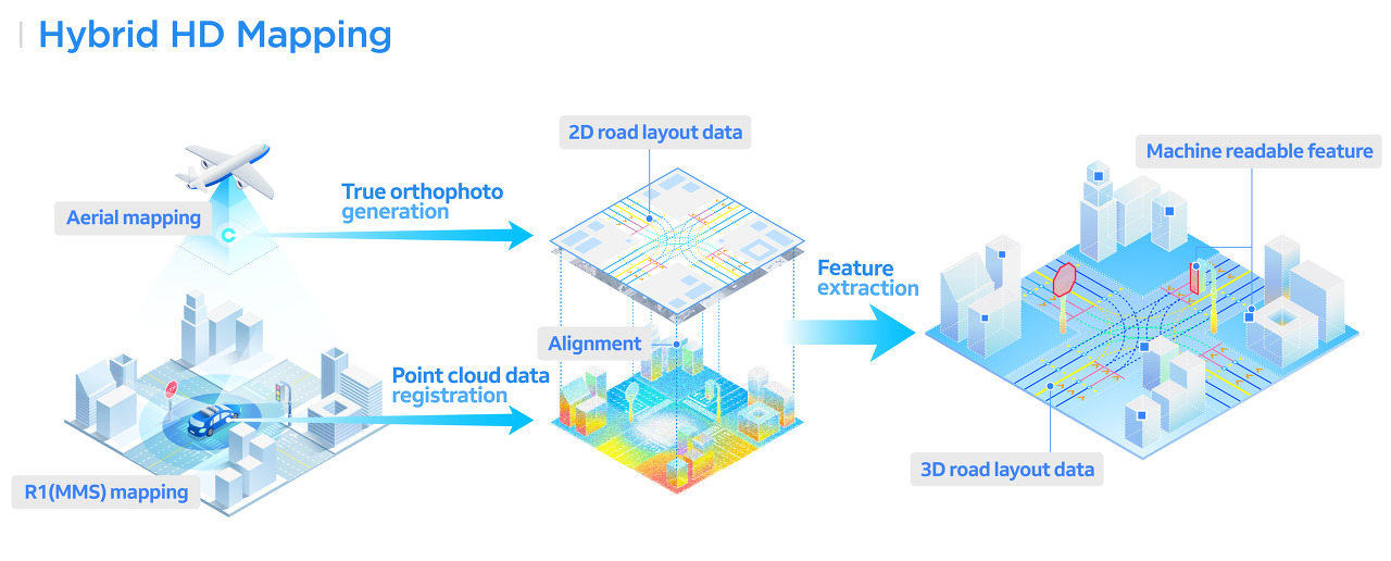 자율주행머신을 위한 도로 HD맵을 제작하는 독창적인 솔루션입니다. 도심 단위 대규모 지역을 촬영한 항공사진 이미지에서 도로 면의 레이아웃 정보를 추출하고, 자체 개발된 MMS (mobile mapping system)인 R1이 수집한 데이터를 유기적으로 결합하는 방식으로 광대한 영역의 HD맵을 빠르고 정확하게 제작하는데 효과적인 방식입니다.