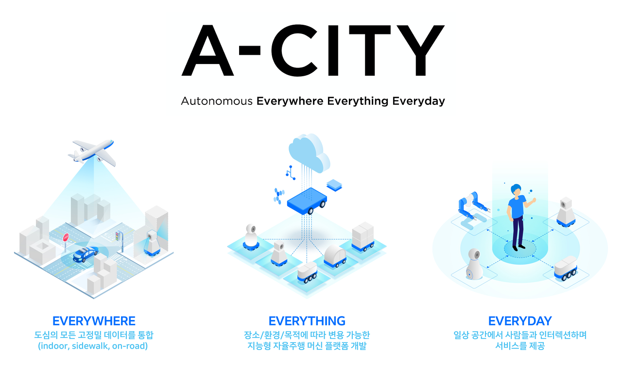 A-CITY는 네이버랩스의 기술로 도전하는 미래 도시상입니다. 도심의 각 공간들을 다양한 자율주행 머신들로 연결하고, 인공지능이 방대한 데이터를 분석해 예측하며, 공간 데이터를 정보화하고 업데이트하여 배송과 물류 등의 서비스들까지 자동화 되는 도시를 위한 기술을 연구합니다.