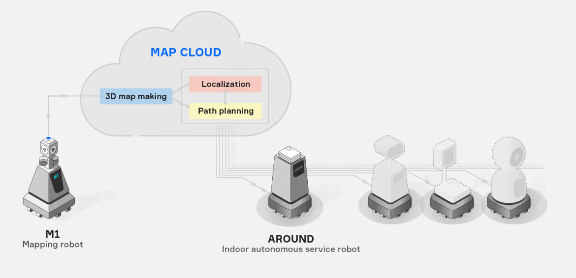 AROUND플랫폼은 자율주행 서비스 로봇 대중화를 목표로 네이버랩스가 개발한 독자적인 솔루션입니다. 매핑 로봇 M1이 만든 맵 클라우드(map cloud)를 기반으로 위치를 인식하여 경로를 계획하고, 심층 강화학습 (deep reinforcement learning) 알고리즘을 적용해 레이저스캐너의 도움 없이 매끄러운 자율주행이 가능하다는 것이 특징입니다. 지도 생성, 위치 파악, 경로 생성, 장애물 회피 등의 핵심 기능을 직접 수행해야 하는 기존 많은 자율주행 로봇과는 달리, 저가의 센서와 낮은 프로세싱 파워만으로 정확도 높은 실내 자율주행을 구현했습니다.