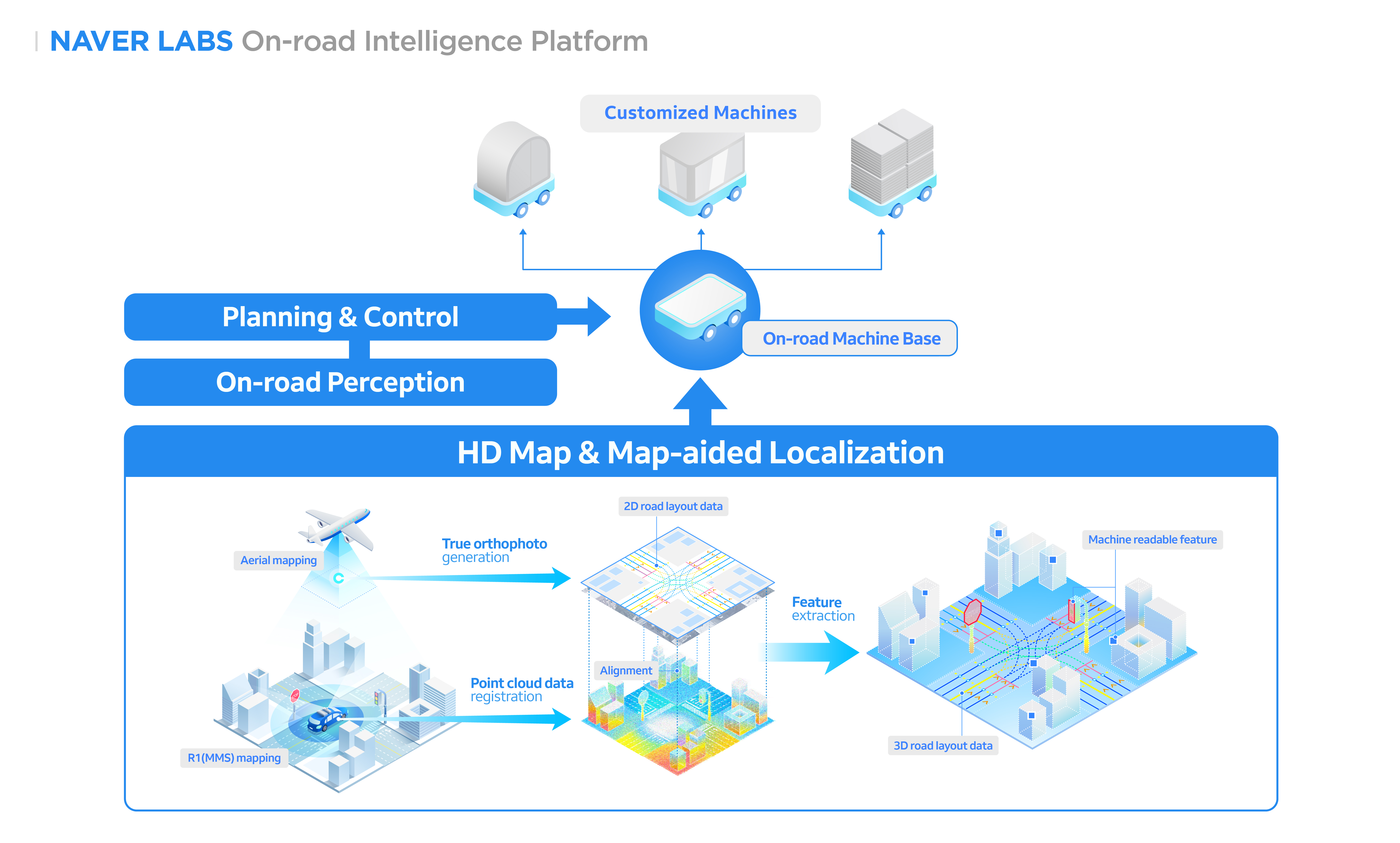 네이버랩스는 2017년 IT업계 최초로 국토부 자율주행 임시운행을 허가 받은 이후 실제 도로 위에서 측위, 인지, 플래닝과 컨트롤에 이르는 모든 영역의 도로 자율주행 기술들을 종합적으로 고도화하고 있습니다. 또한 하이브리드 HD매핑과 ACROSS 솔루션으로 도로 자율주행을 위한 HD맵을 제작합니다. 이러한 기술들과 데이터를 통합하여 이후 물류/배송/ 무인샵 등 다양한 목적으로 커스터마이즈할 수 있는 도로 자율주행 머신 플랫폼을 개발하고 있습니다.