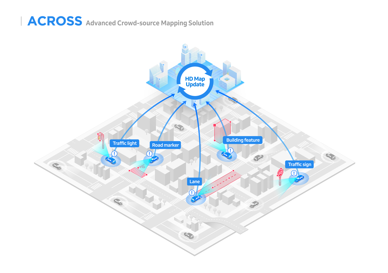 머신을 위한 지도 역시 최신성은 중요합니다. 네이버랩스에서는 도로 HD맵을 위한 ACROSS 프로젝트와 실내 지도를 위한 셀프업데이팅맵 기술을 연구합니다. ACROSS는 다수의 차량에 장착한 매핑 디바이스로 도로 레이아웃(차선 정보, 정지선 위치, 도로 마커 등)이나 3차원 정보(교통표지판, 건물, 신호등, 가로등 등)의 변화를 감지하여 업데이트하는 기술입니다. 셀프업데이팅맵은 자율주행로봇과 AI를 통해 대규모 쇼핑몰의 POI 변화를 자동으로 인식하는 기술입니다.