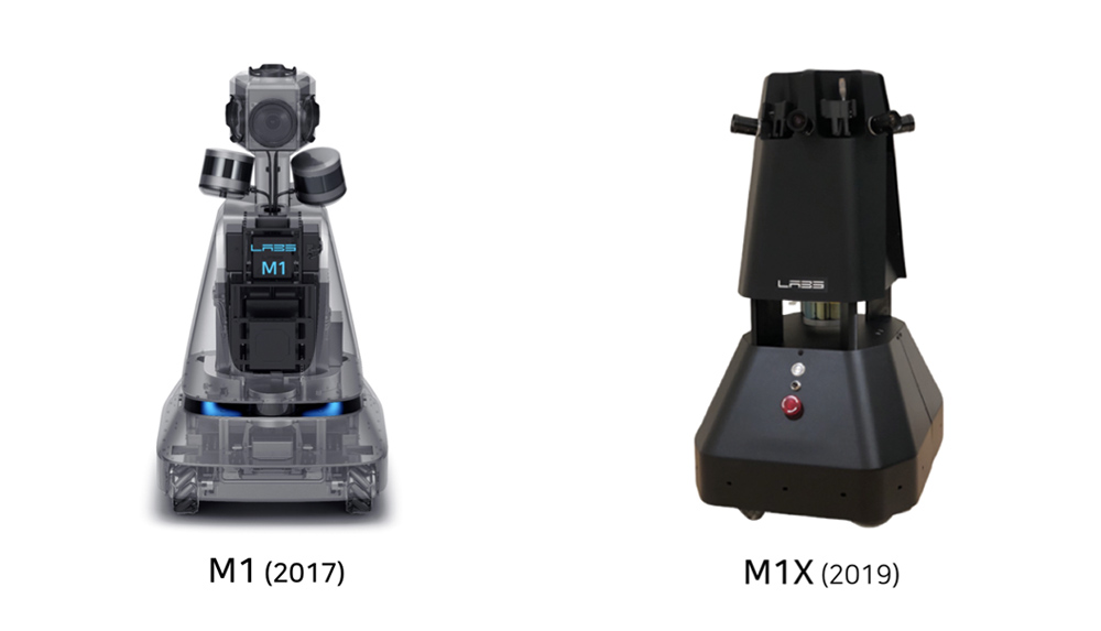 M1은 실내 공간의 3차원 고정밀 지도를 제작하는 매핑 로봇입니다. LiDAR로 수집한 포인트 클라우드에 SLAM 기술을 적용하여 만든 고정밀 지도는 실내 자율주행 서비스 로봇을 비롯해 다양한 위치 기반 서비스의 핵심 데이터로 사용됩니다. 현재 M1의 업그레이드 버전인 M1X를 통해 정확도를 높이는 동시에 데이터 활용성을 더욱 확장하고 있습니다.