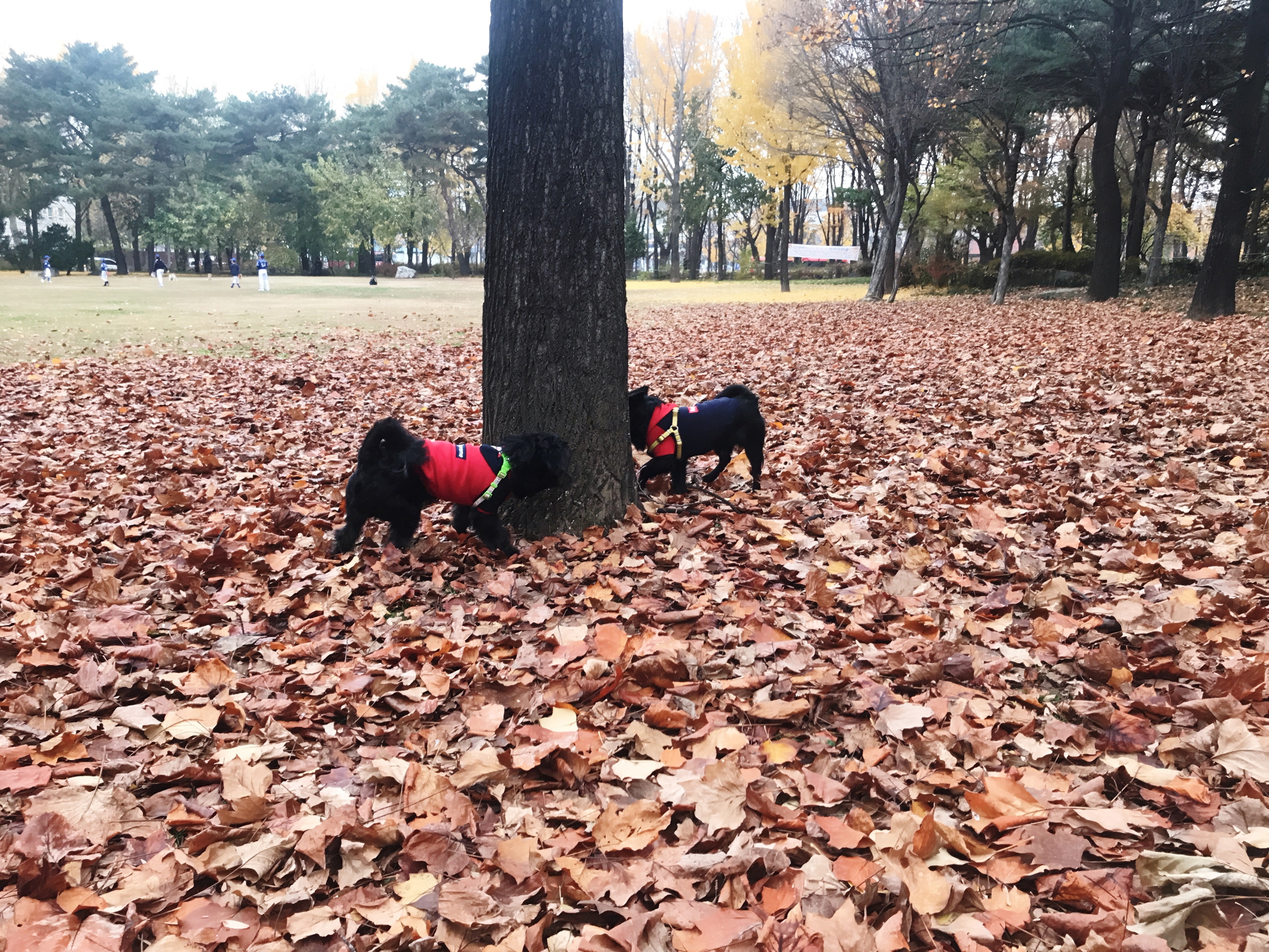 가을에도 역시나 미처 날뜁니다. 낙엽이 뭐가 그리도 좋은지 아주 굴러다닙니다.