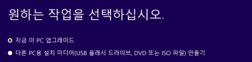 동의를 눌러주시고 몇 가지 항목을 준비하는 중 화면이 자동으로 진행되면 다른 PC용 설치 미디어 버튼이 활성화 됩니다. 다음을 눌러주신 다음에 언어, 아키텍처 및 버전 선택에서 다음을 눌러주시고 USB 플래시 드라이브 를 클릭해줍니다.