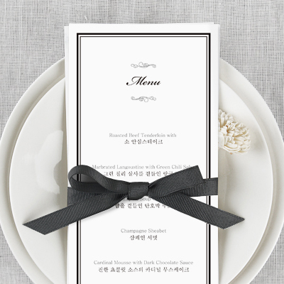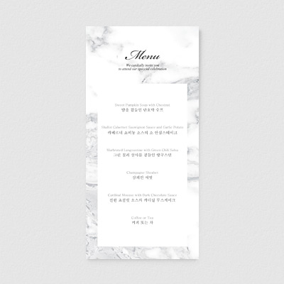 쉽게 제작할 수 있으면서도 고급스러운 느낌을 살리는 마블 배경의 레스토랑 메뉴판입니다. 레스토랑뿐만 아니라, 각종 청첩장이나 웨딩 관련 디자인으로 살려도 좋을 것 같습니다.