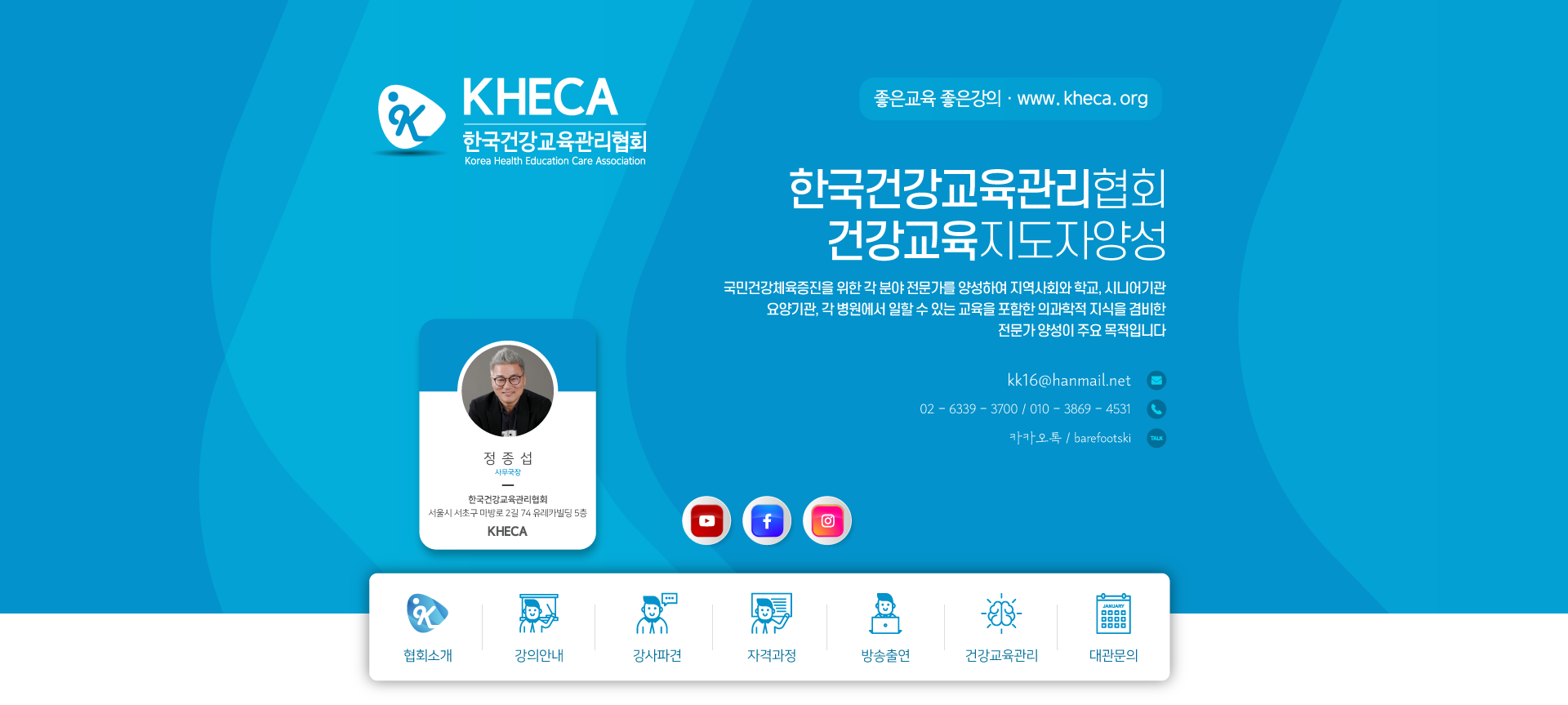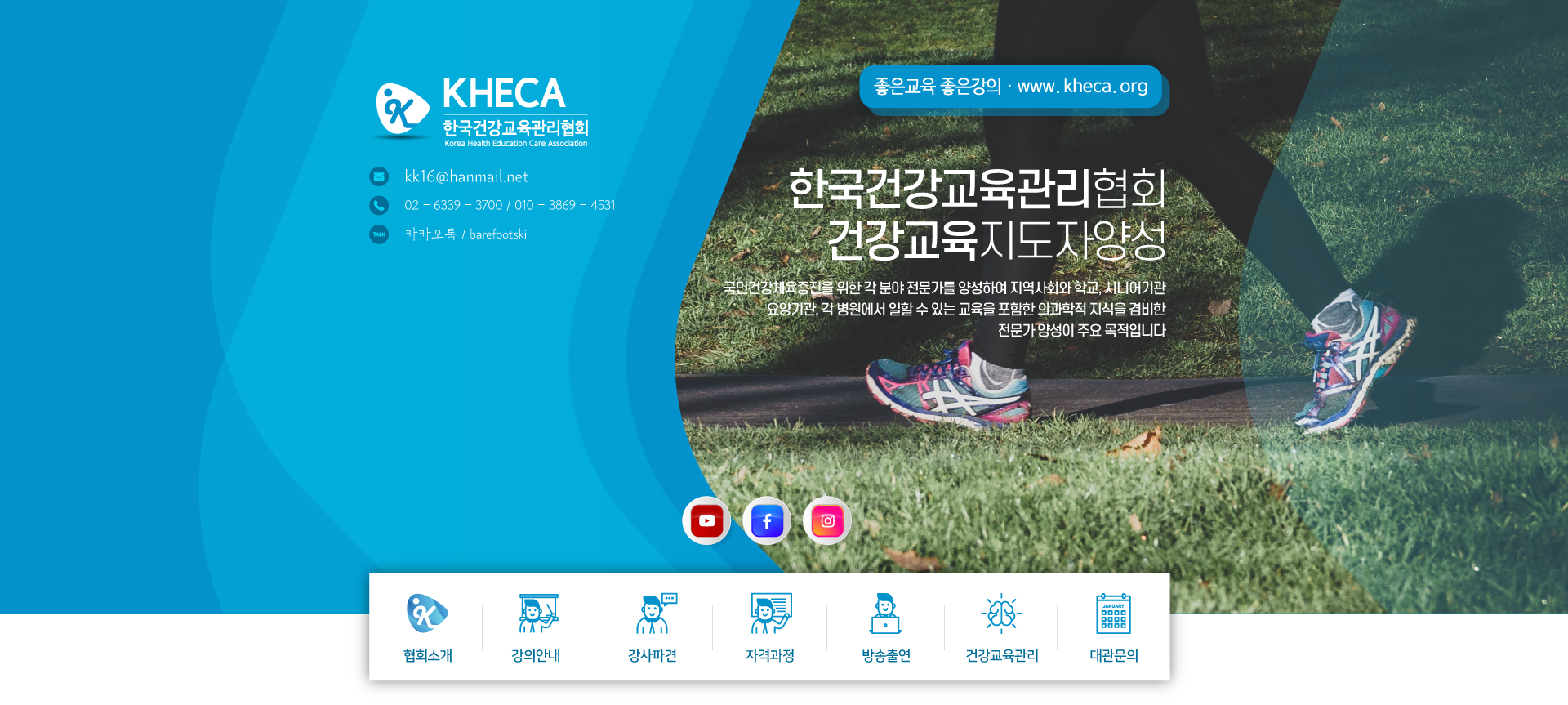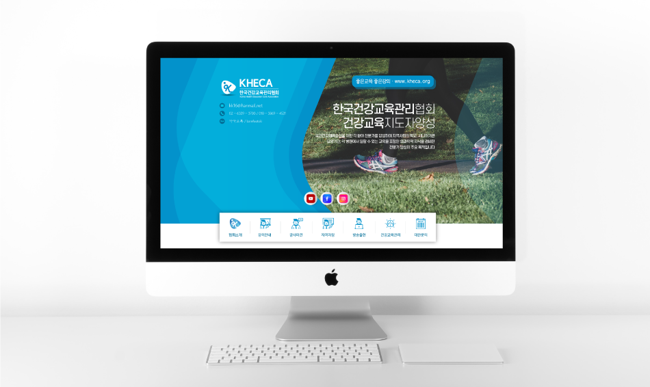 | 제작 방향 | 한국건강교육관리 협회의 기본 심볼과 포인트 컬러를 참고하여 협회와 단체의 느낌을 최대한 살리면서도 심플하고 깔끔한 느낌을 유지할 수 있도록 제작하였습니다. 화이트 컬러와 블루 컬러를 통해서 한국건강교육관리협회가 가진 느낌을 강조하고 메뉴를 7가지 형태로 구성하여 다양한 협회활동과 교육, 강의, 지도자양성, 방송출연, 건강교육관리, 대관 문의와 같은 카테고리명으로 구성하였습니다. 소셜링크를 연동하기 위해 페이스북과 유튜브, 인스타그램 아이콘을 삽입하였습니다. |