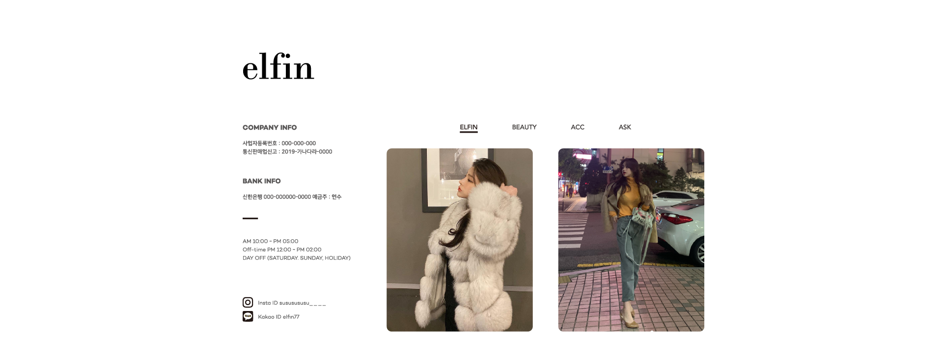 | 제작 방향 | 깔끔한 디자인으로 제작된 사이트입니다. 간단한 사업자정보 및 소셜링크는 왼쪽 레이아웃에, 메뉴는 텍스트 앵커로 연결하고, 오른쪽 하단에는 이미지를 삽입하였습니다. 왼쪽 상단에는 로고를 넣은 깔끔하고 심플한 홈페이지형 블로그디자인입니다. |
