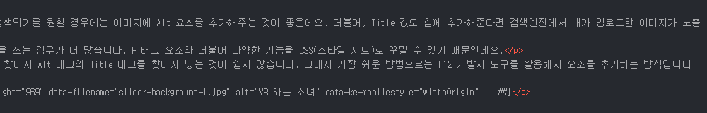 다소 복잡해보이지만, 이 방법이 익숙해지면 매우 쉽게 Alt 요소를 추가할 수 있습니다. 이 과정이 조금은 귀찮아도 글을 쓸 때, 이미지에 삽입해주시면 검색 노출에 있어서 유리해질 수 있습니다. 티스토리도 또 하나의 웹사이트로써 SEO의 많은 부분에 영향을 받는다는 점을 기억하세요.