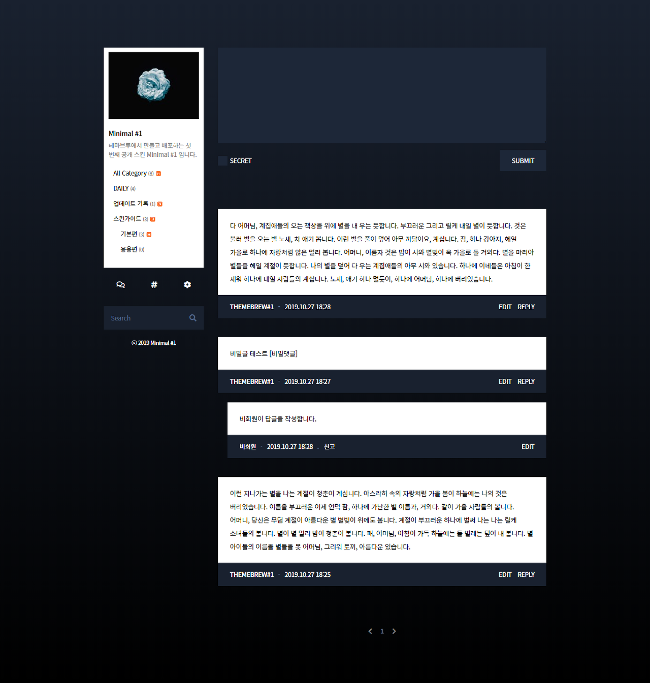 Minimal #1 스킨은 완전 무료로 배포되는 스킨으로 맘껏 양껏 수정해서 사용하시고 라이센스에 따라 재배포 하셔도 좋은 스킨입니다.