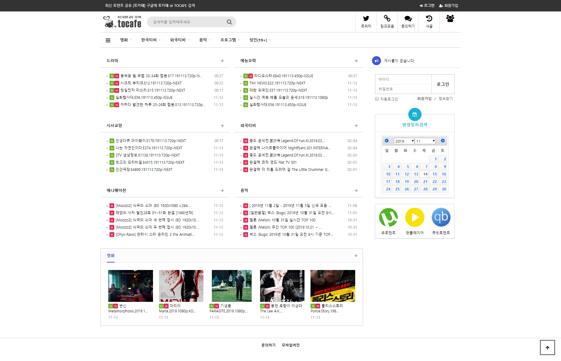 토렌트 사이트는 광고수익을 위해서 운영되고 있는 경우가 많습니다. 그나마 깔끔하고 심플한 느낌의 토렌트 공유 사이트를 하나 찾았습니다. 토카페라는 곳이고 토렌트 커뮤니티 특성상 주소가 계속 변경되고 언제 폐쇄될지 모르기 때문에 그때그때마다 찾아서 보는 경우가 많습니다. 다양한 오락이나 예능 프로그램, 음원 파일들이 토렌트 사이트를 통해서 공유가 되고 있습니다.