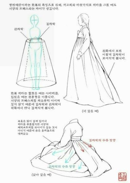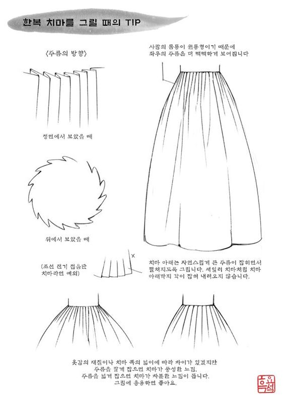 특히, 생각보다 한복을 아름답게 그려내는 것이 굉장히 어렵기 때문에, 어떤 식으로 그려야할지는 흑요석님이 정리해둔 글을 잘 참고하면 자연스럽게 한복을 입은 여자를 그릴 수 있을 것이다.