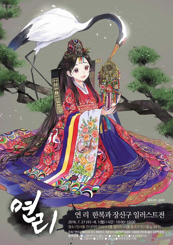 2016년 안서동에서 열린 연 리 한복과 장신구 일러스트전 - 위의 일러스트는 김보라님이 그린 한복 일러스트다. 일러스트 동인팀 연리이고, 인사동에서 전시를 자주 하던데, 미리 알았다면 꼭 갔을 것이다. 참고로 트위터에서 다양한 이미지들을 살펴볼 수 있다.