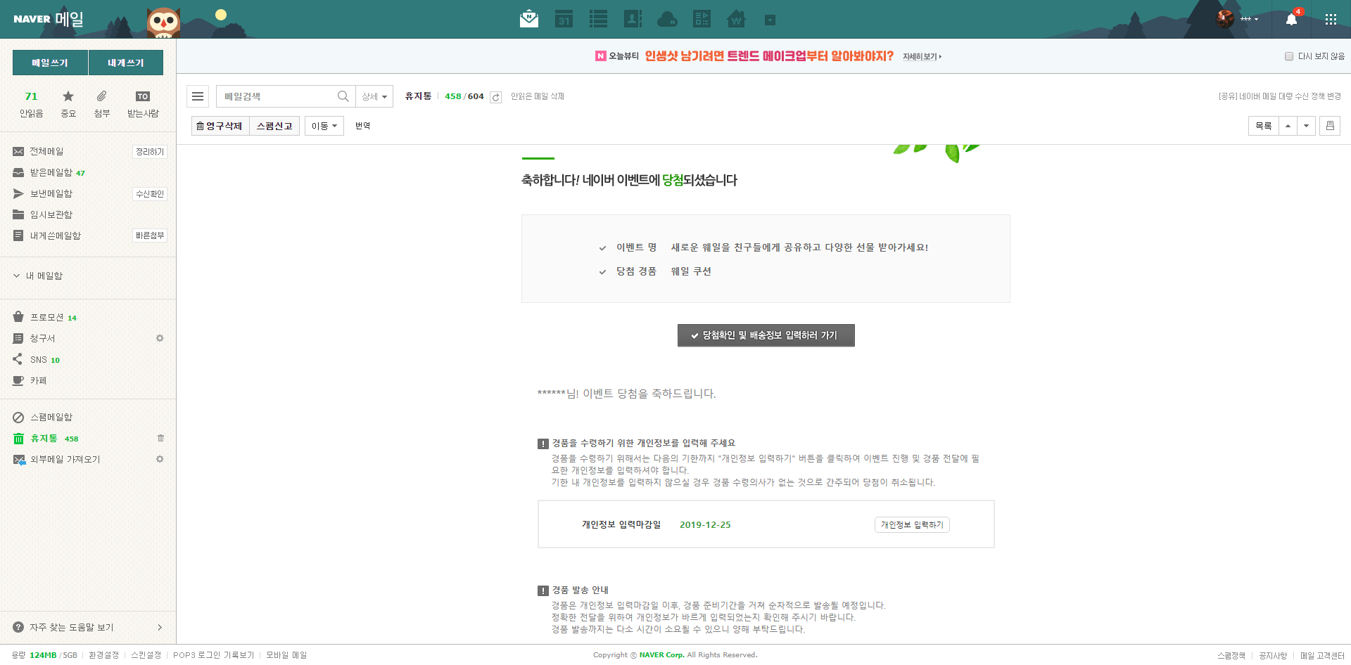 개인정보는 별표처리 하였습니다. 당첨확인 및 배송정보를 입력하기 버튼을 클릭해서 당첨확인을 해주고 배송받을 주소를 입력하면 됩니다. 만약, 메일이 온 줄 모르고 기한 내 개인정보를 입력하지 않았다면 경품 수령의사가 없는 것으로 간주되어 당첨이 취소되었을 겁니다.