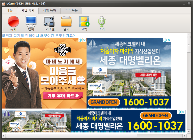일단 오캠을 살펴보겠습니다. 오캠은 국내 개발사에서 개발한 소프트웨어 프로그램인데, 이렇게 전면에 광고 배너가 덕지덕지 있어도 기능만큼은 매우 훌륭한 프로그램이라고 할 수 있겠습니다. 가장 중요한 기능은 화면 녹화, 게임 녹화, 소리 녹음, 그리고 코덱 설정입니다. 움짤 만드는 기능이라고 별도의 메뉴로 구성이 되어 있지 않고, 이미지 또는 영상을 녹화할 때 녹화된 프로그램을 코덱 설정을 통해서 움짤 이미지로 결과물이 제작되게 변경할 수 있습니다.