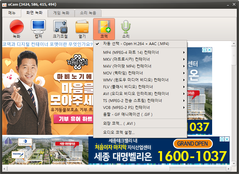 일단 오캠을 살펴보겠습니다. 오캠은 국내 개발사에서 개발한 소프트웨어 프로그램인데, 이렇게 전면에 광고 배너가 덕지덕지 있어도 기능만큼은 매우 훌륭한 프로그램이라고 할 수 있겠습니다. 가장 중요한 기능은 화면 녹화, 게임 녹화, 소리 녹음, 그리고 코덱 설정입니다. 움짤 만드는 기능이라고 별도의 메뉴로 구성이 되어 있지 않고, 이미지 또는 영상을 녹화할 때 녹화된 프로그램을 코덱 설정을 통해서 움짤 이미지로 결과물이 제작되게 변경할 수 있습니다.